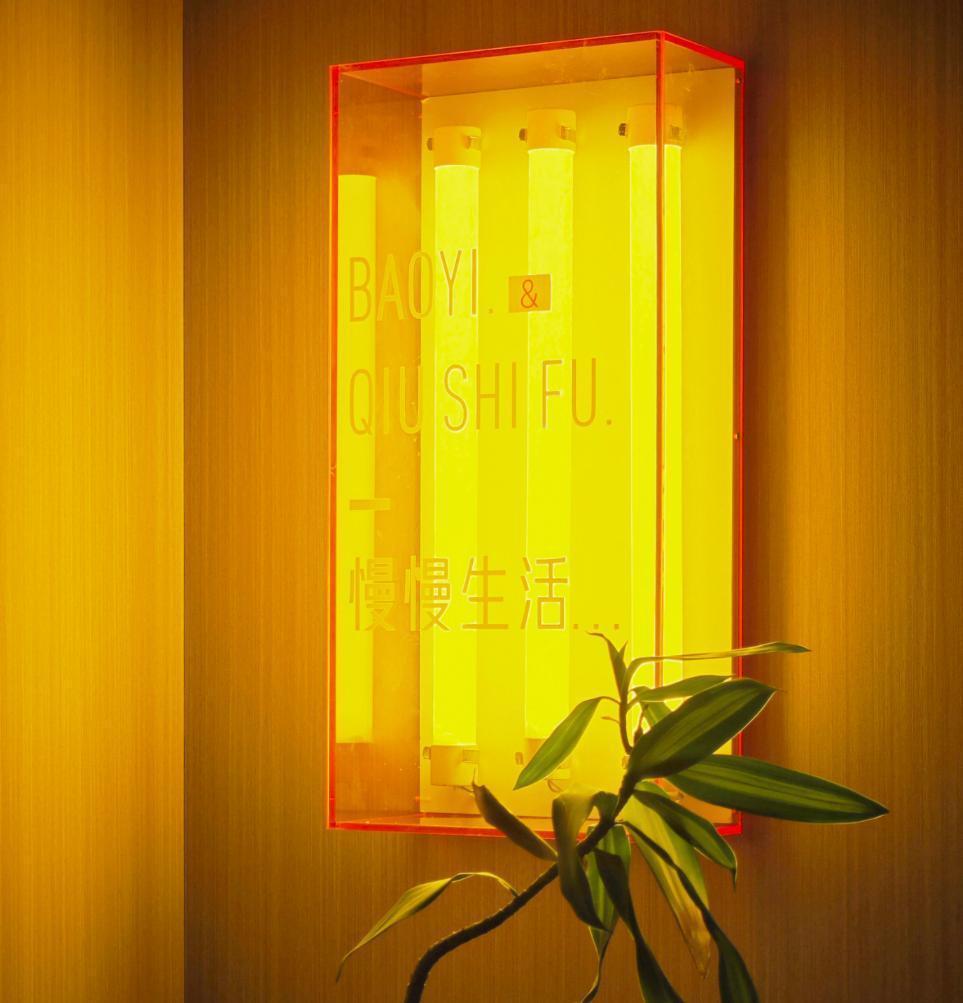 沙发区另一侧墙面定制了一盏温暖的灯箱,并且还将家人的名字隐藏在了logo里,拉满了生活的仪式与归属感。