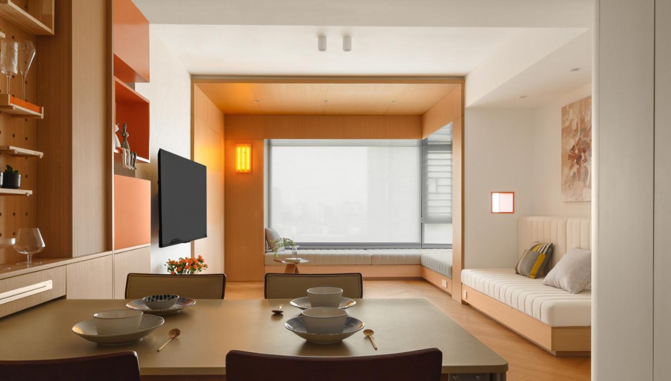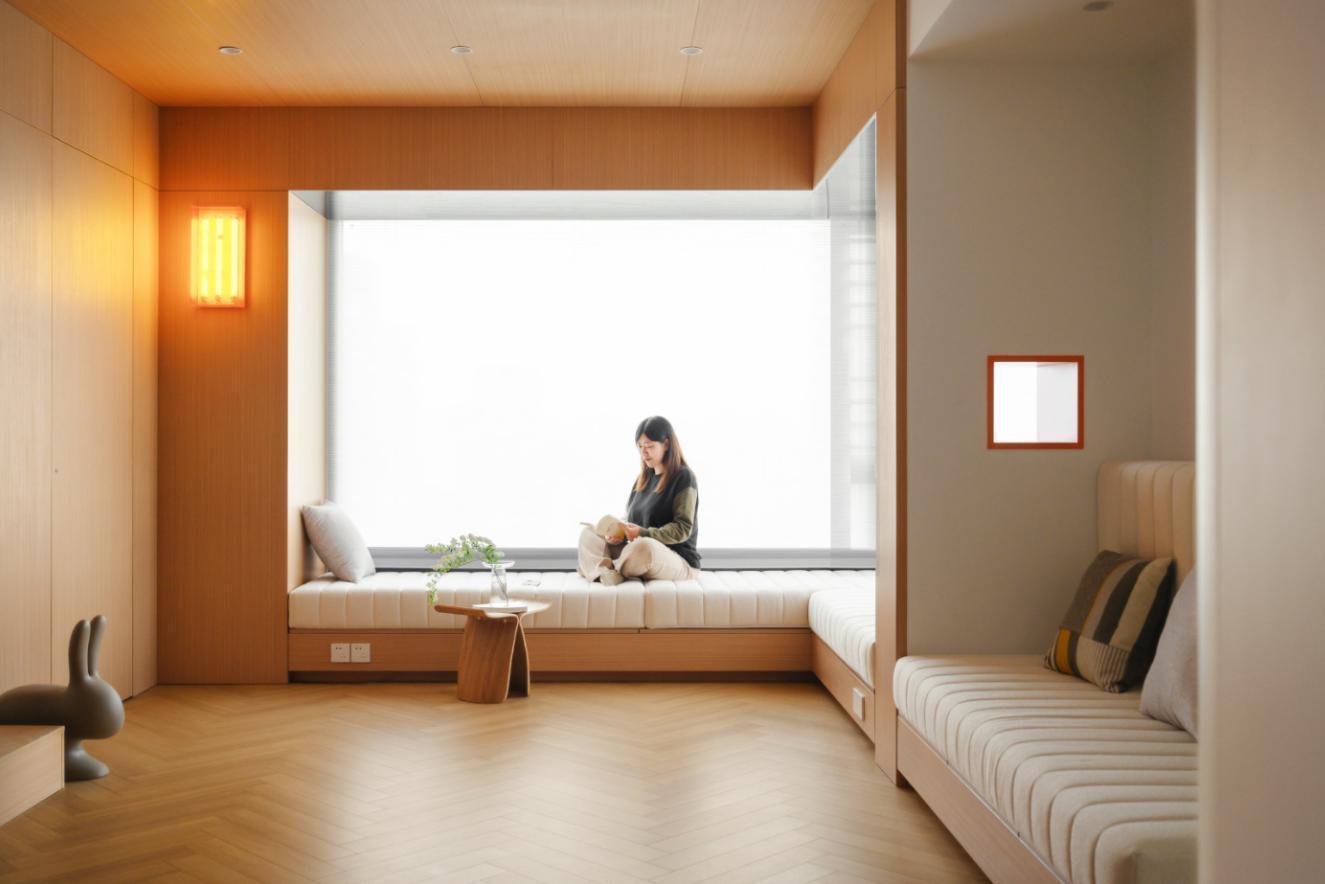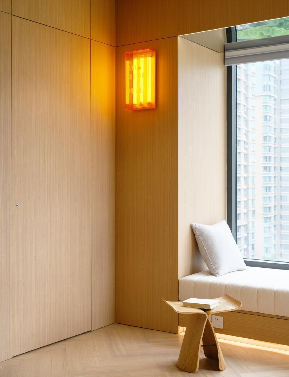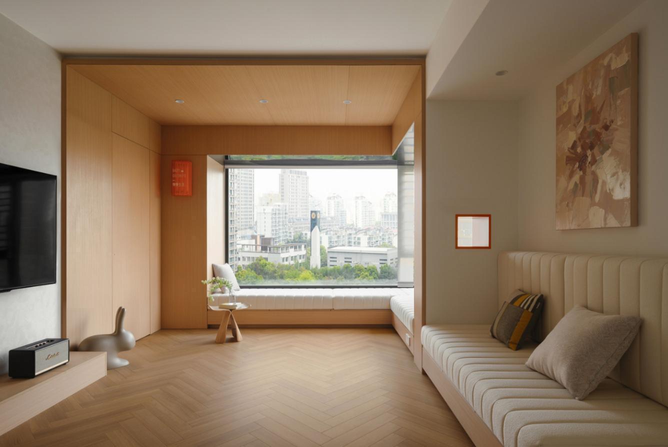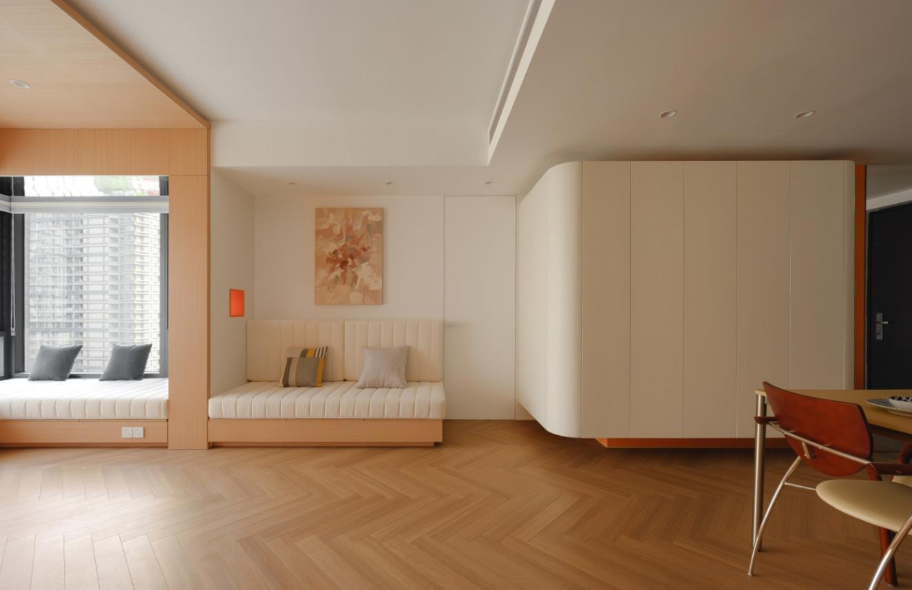 当飘窗区纳入客厅之后,墙顶面均包上了木饰面,进一步提升了空间的氛围感与休闲属性,并且还让左侧的次卧门实现了隐形,使空间更加整体秩序。