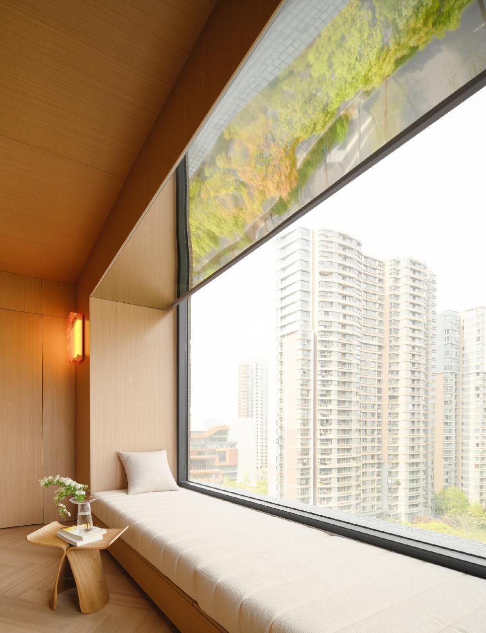 飘窗台顶面安装镜面不锈钢,巧妙地引入了室外的植被,继而产生不同层次的景色。而全景玻璃窗设计,也带来了无限的视野表现。
