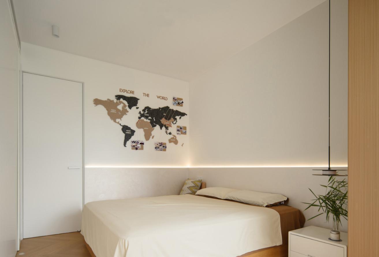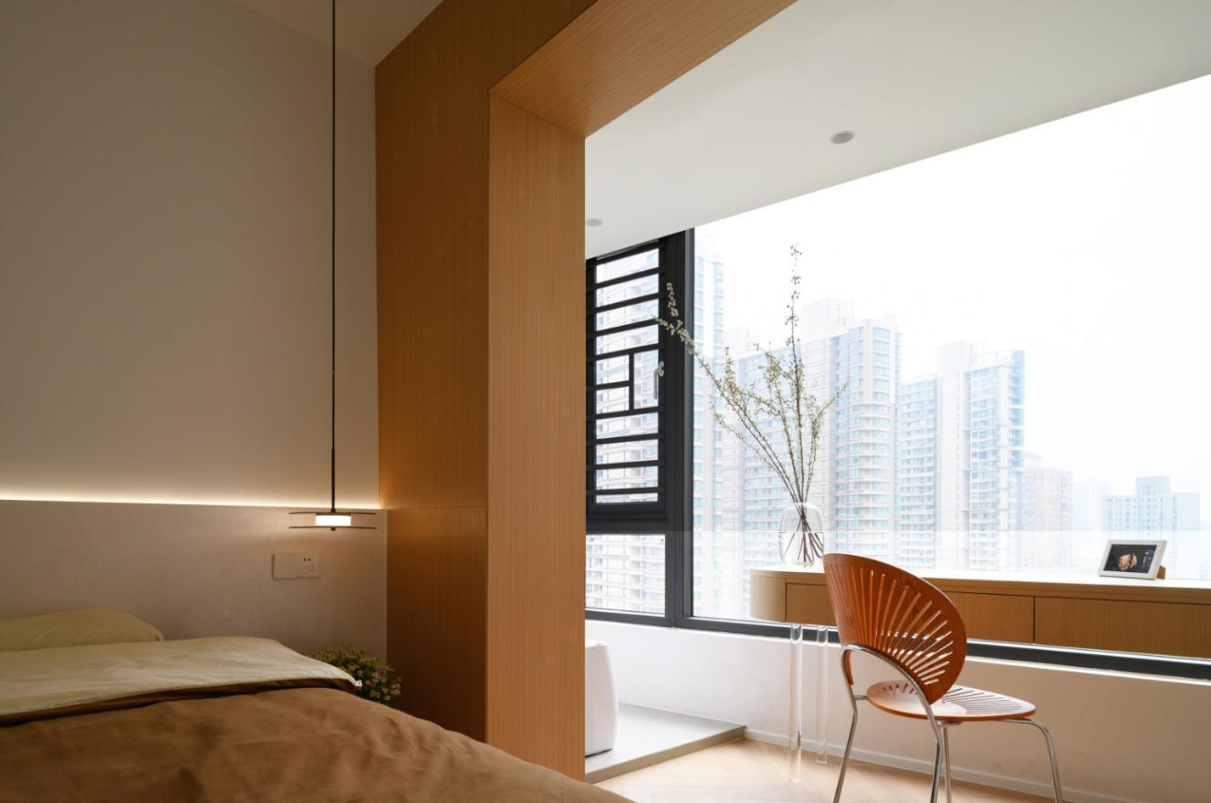 主卧延续了简洁的基调,让睡眠氛围更加放松舒适。不过极简的护墙+灯光设计,却也拉伸了空间层次,使其看起来不会太过苍白。