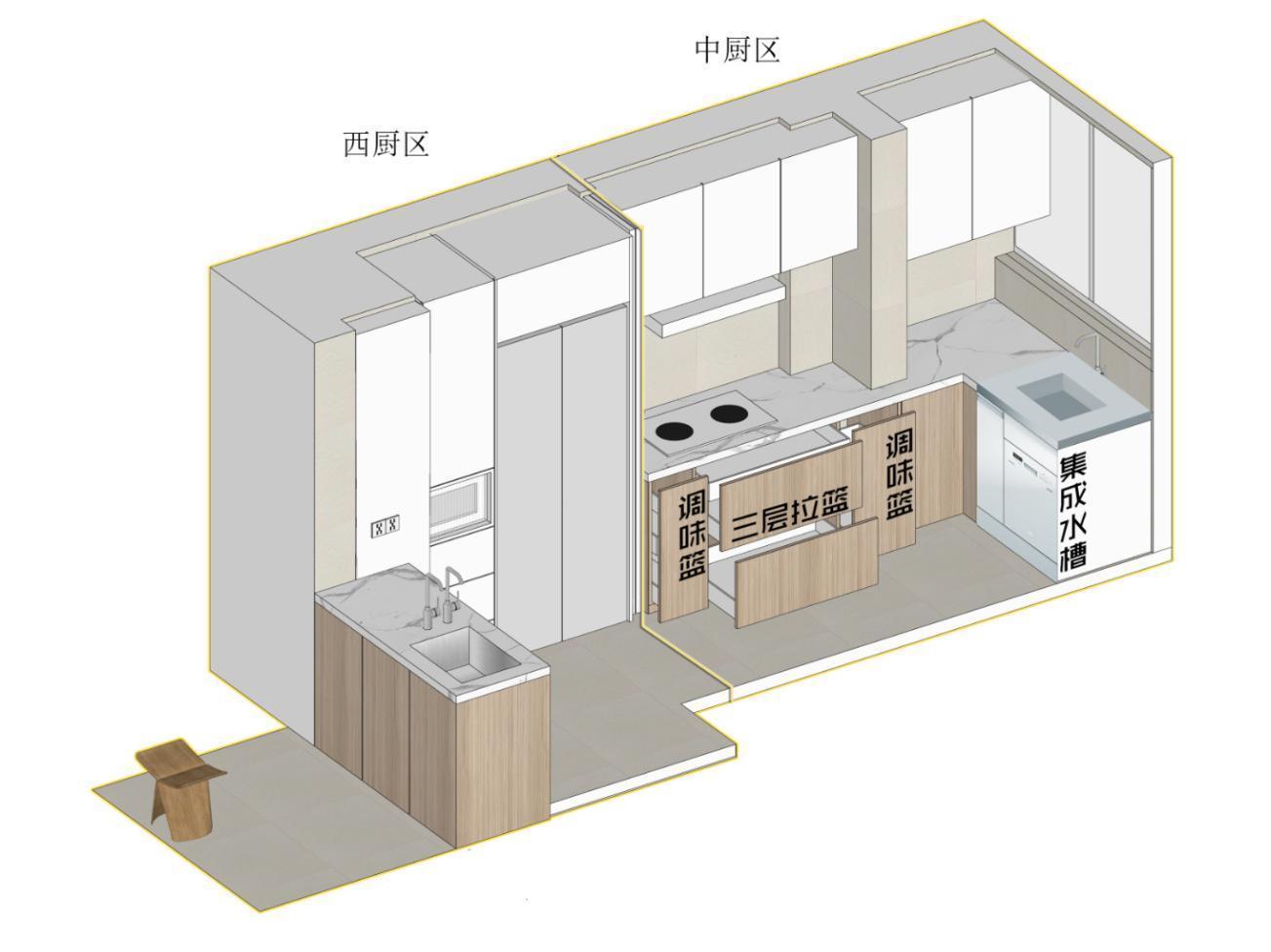 厨房3D示意图展示,当空间向外面的小阳台延伸之后,布局上也做了中西厨分区,以满足不同的烹饪需求,让生活更有品质。