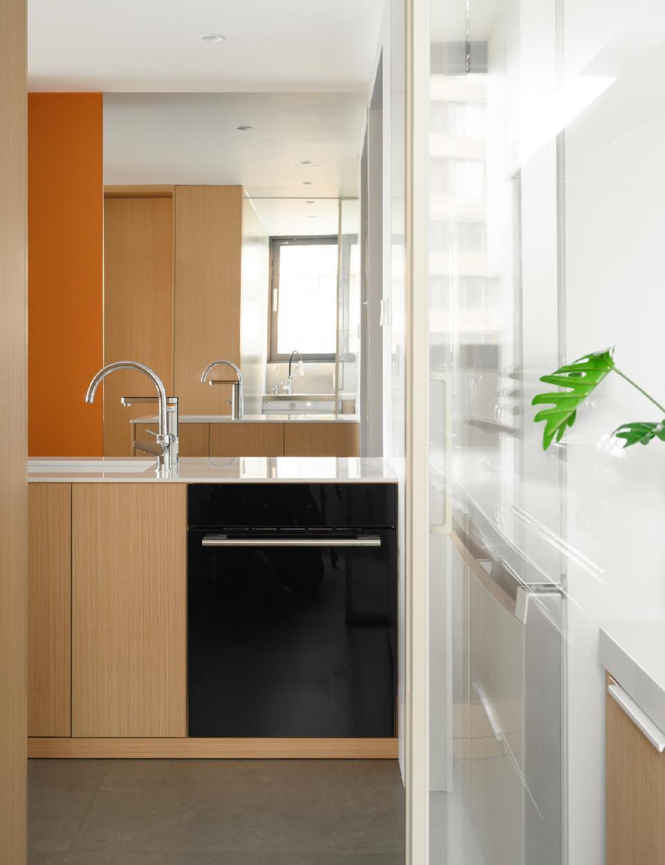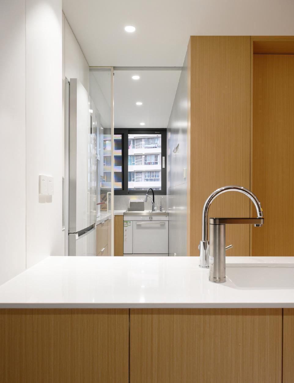 玄关看向厨房视角,利用两组橱柜空隙隐藏移门,日常生活可开可合,并且还强调了空间的整体感。而在内部空间比较紧凑的情况下,选择集成式水槽,也兼具了净水和洗碗机等多种功能。