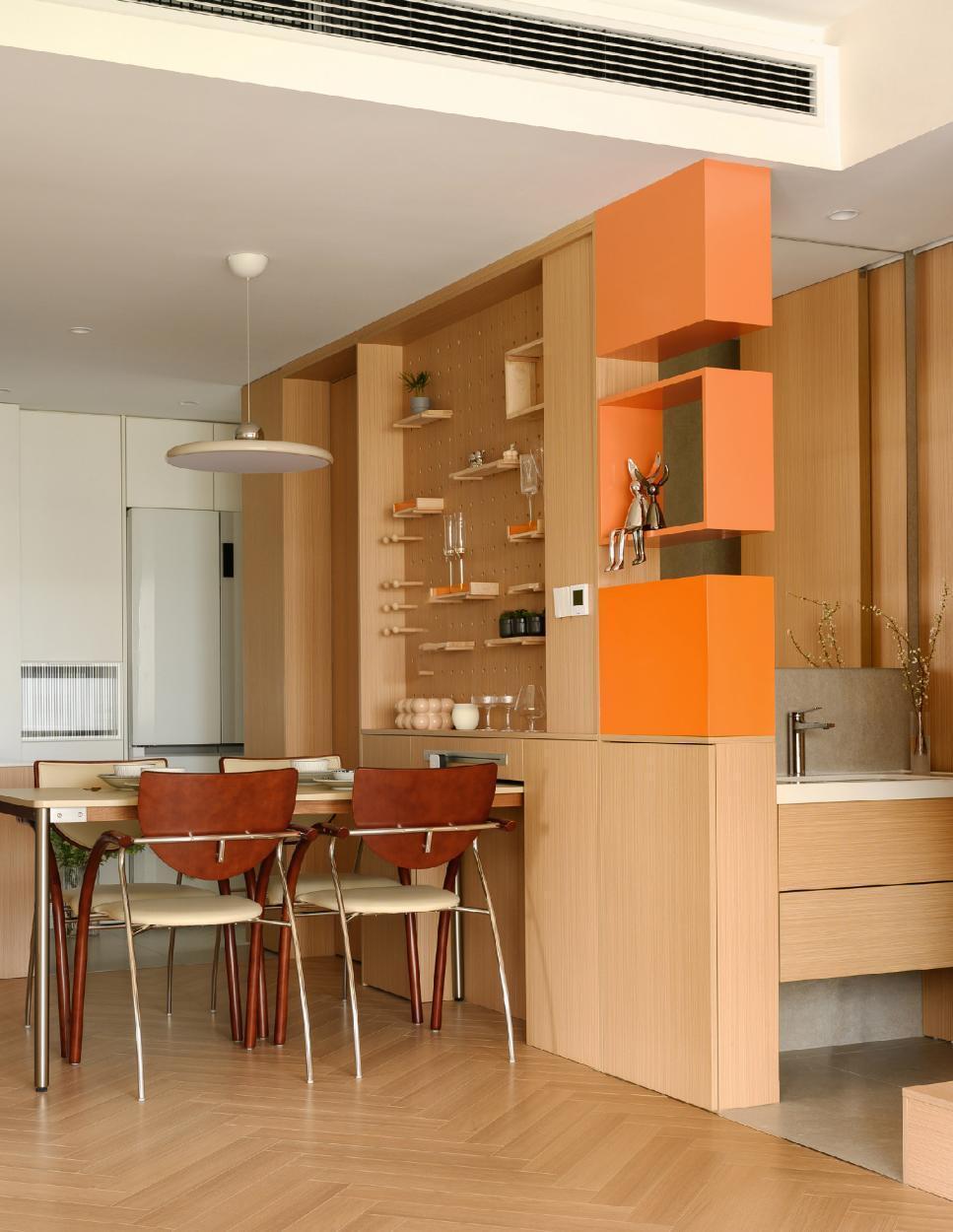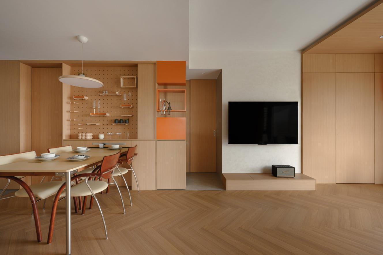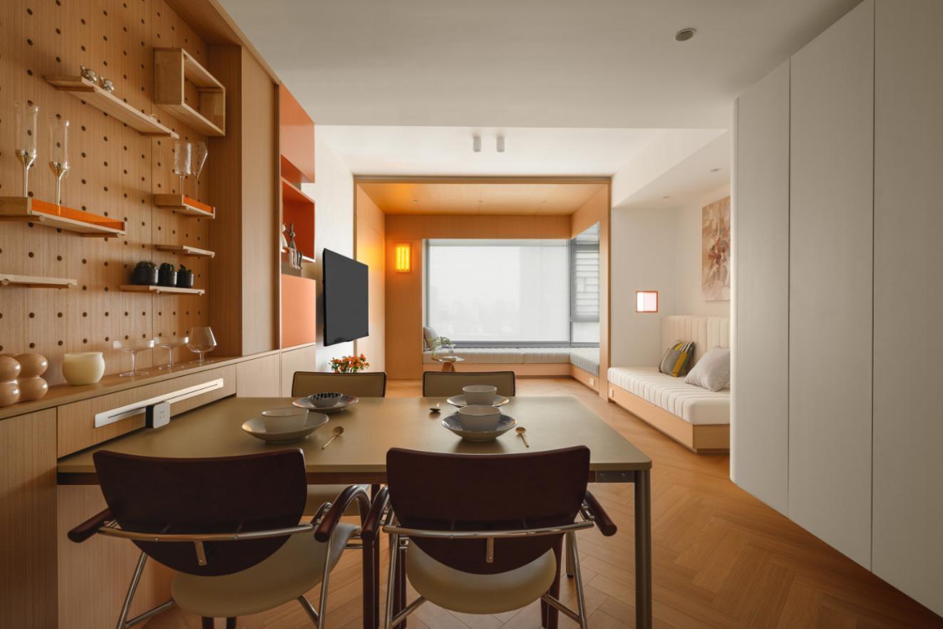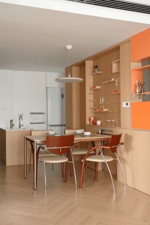 得益于原入户过道较宽的优势,即便将餐厅移到了过道处,也依然有了不错的空间尺度。而在整个空间重组之后,木地板以人字型的方式拼贴,不仅引导了空间动线,也赋予了视觉更多的纵深感。
