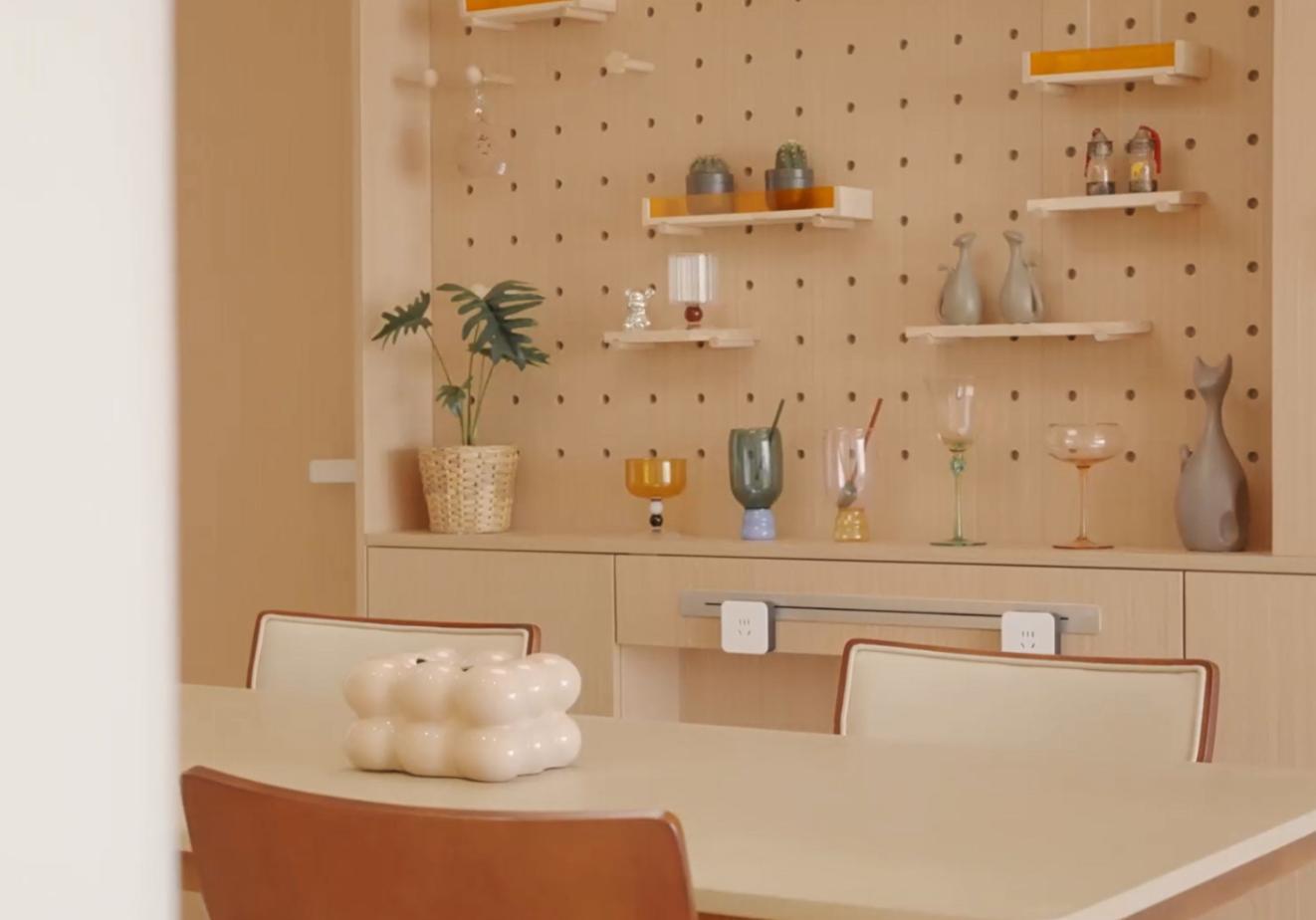 侧面餐边柜,主要以展示功能为主,并摆满了旅游时带回来的杯子。当然,这些不同的纪念品,也见证了夫妻两人的一些记忆。
