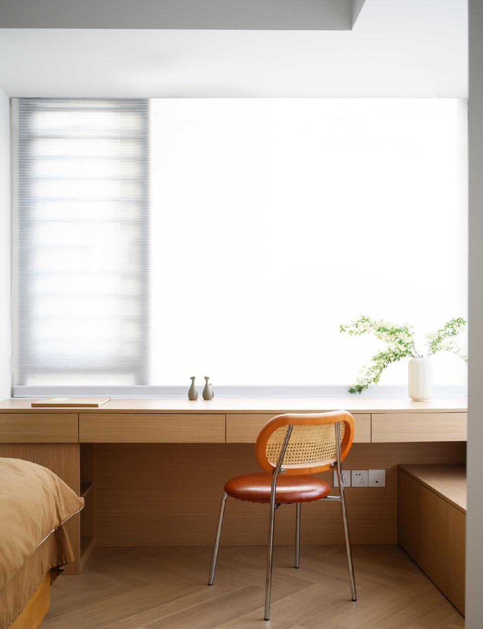 利用转角飘窗台改造的学习区,为空间保留下了足够的成长性,且还兼具了休闲储物功能。